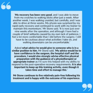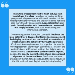 Paul Stones Daycase Conformis Knee Replacement Surgery at Kings Park Hospital.